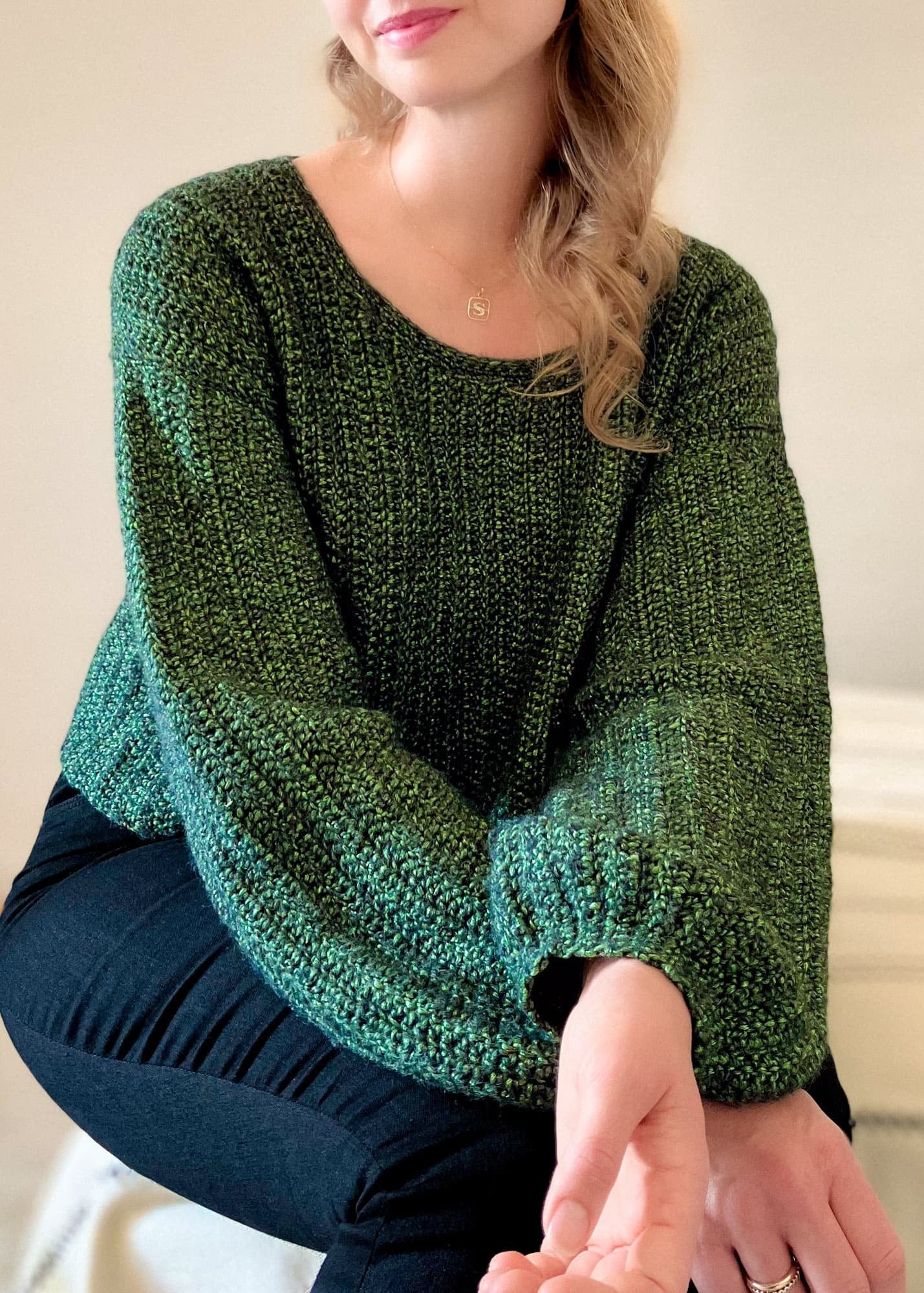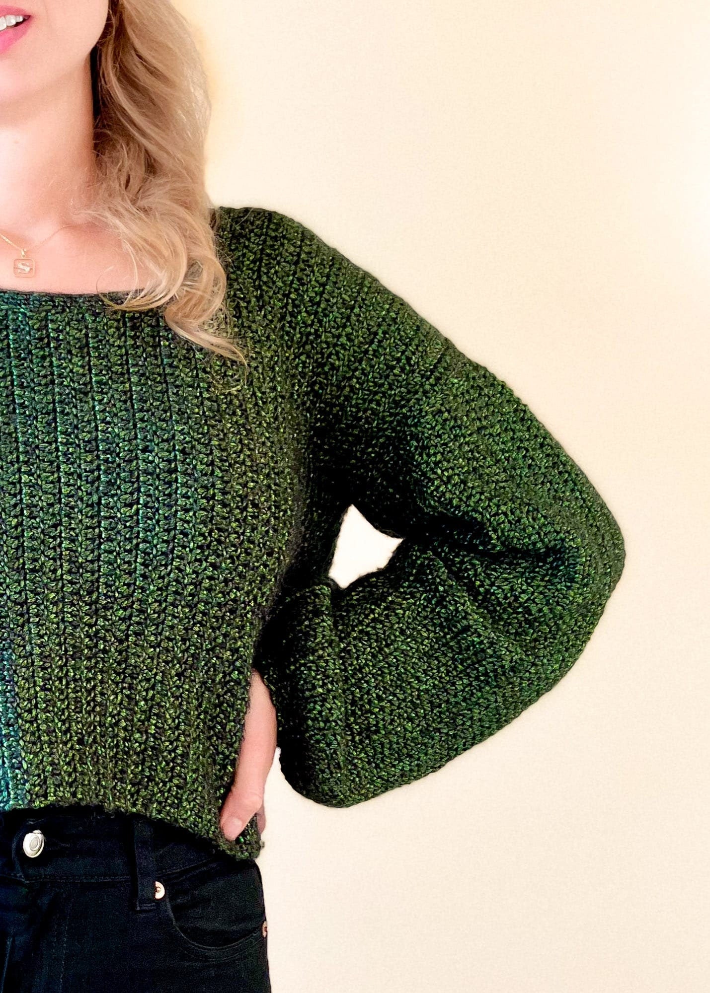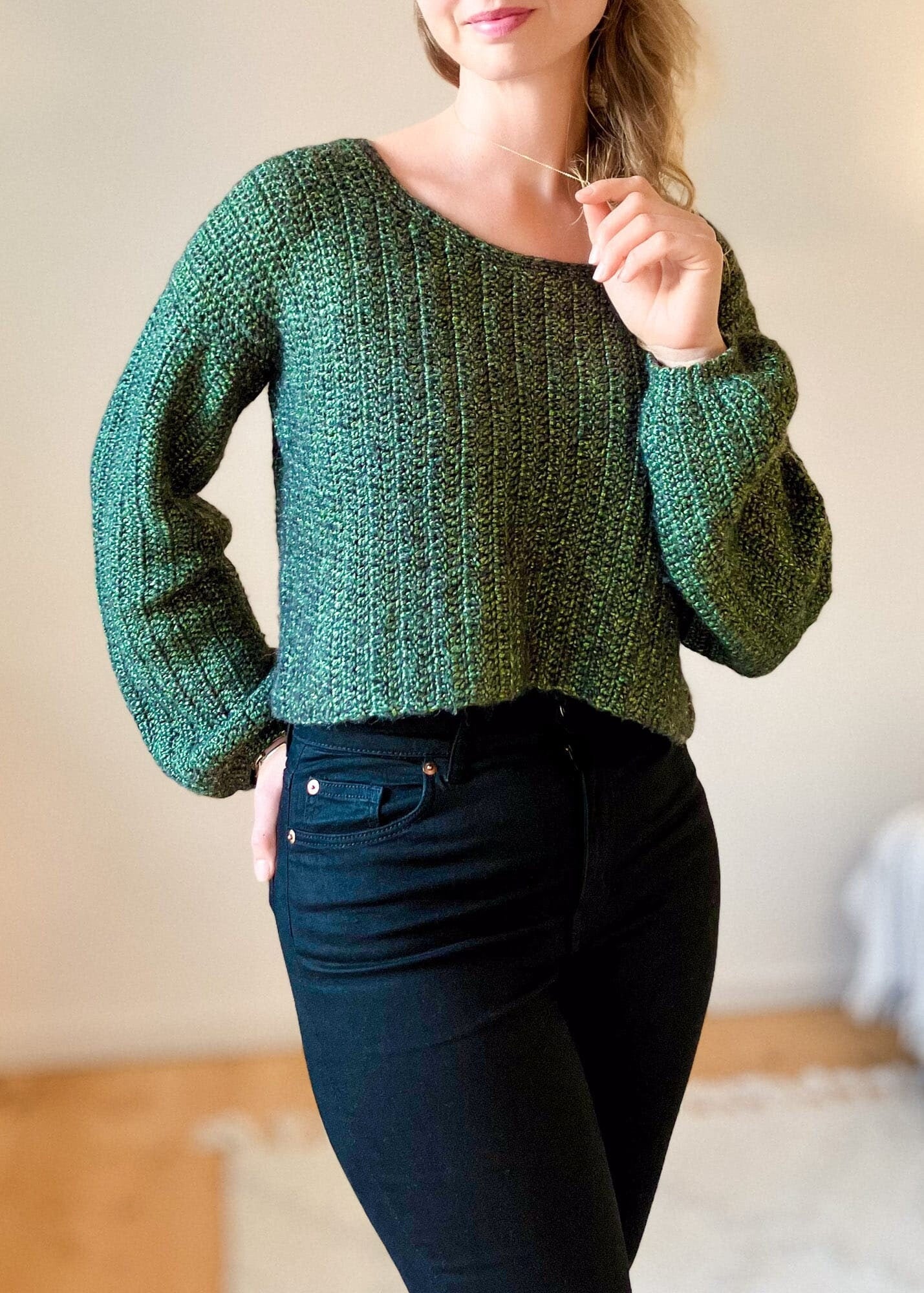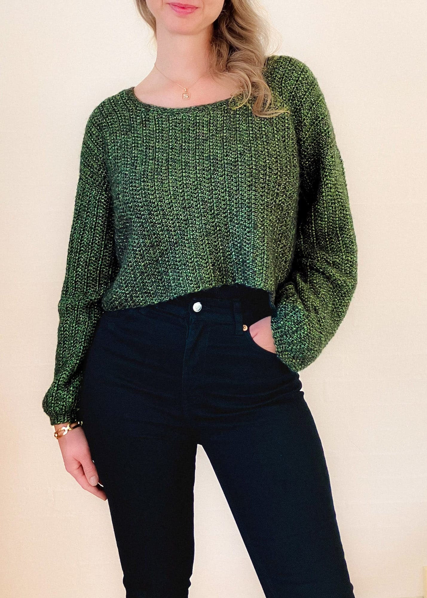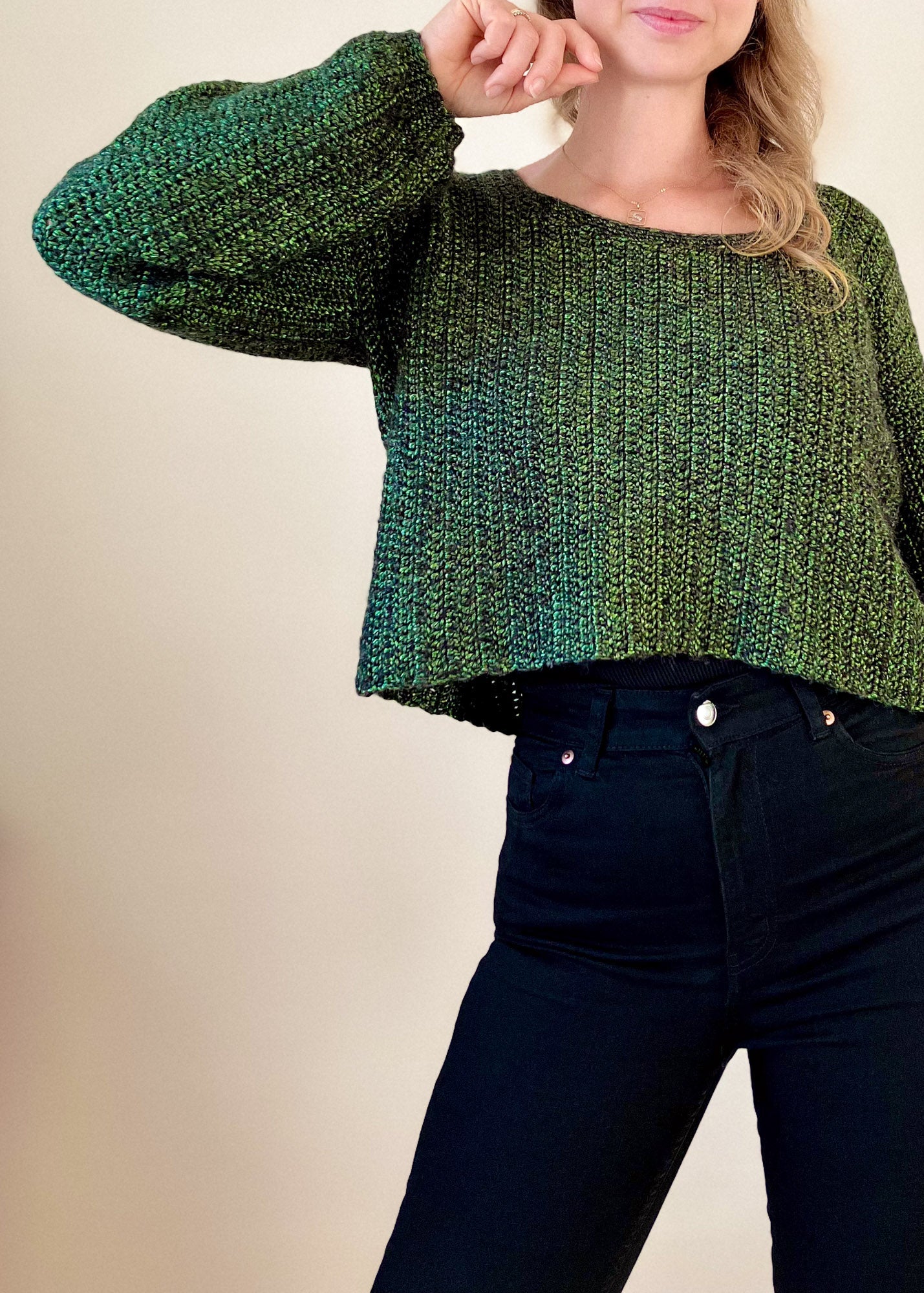 The Aiden Sweater is a super cute crochet sweater made from rectangles. The crochet pullover is loose-fitted, slightly cropped, and has balloon-shaped sleeves. The crochet pattern is made for beginners - all you have to know is how to single and double crochet. The sweater is constructed in a very easy way. You make a front panel, a back panel, and two sleeves which all are worked from side to side. Then you sew them together and add a detail for the neckline.