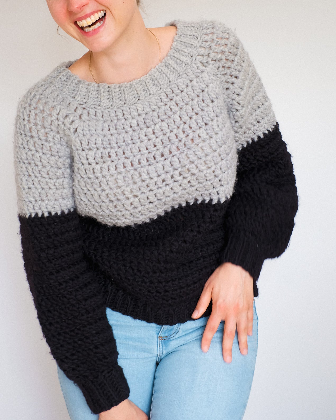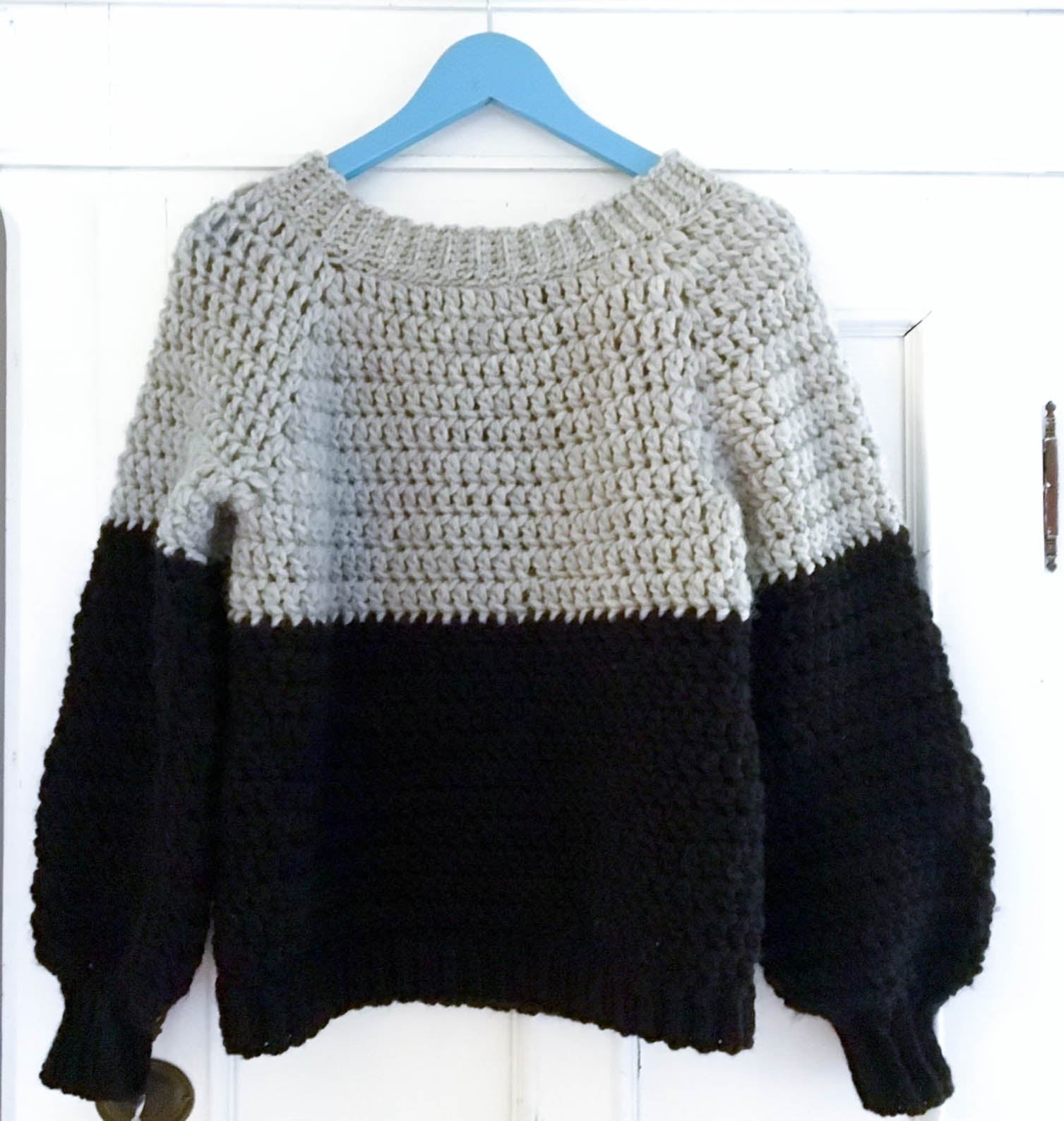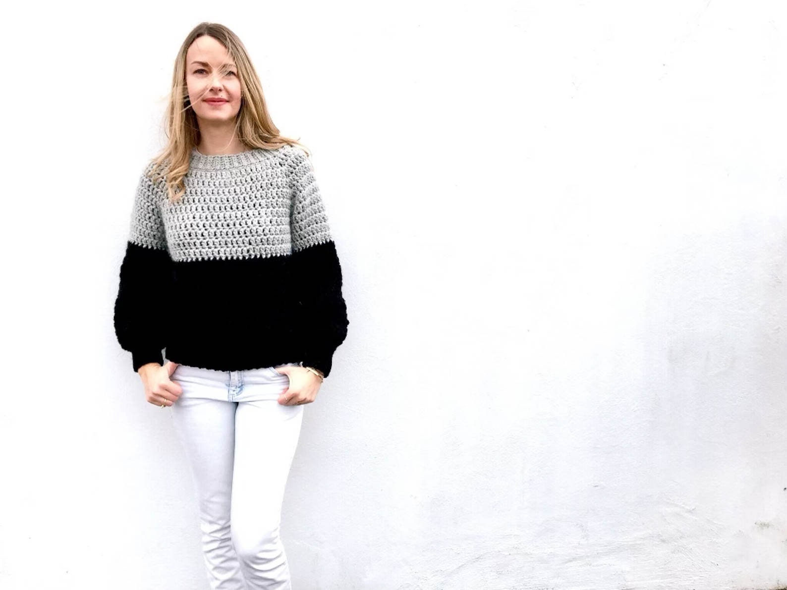 The Chunky Balloon Sweater is a great beginner crochet pattern. The sweater only consists of single crochet and double crochet and is made in one pieces, top down. It has a super comfy, loose fit and cute balloon-shaped sleeves.