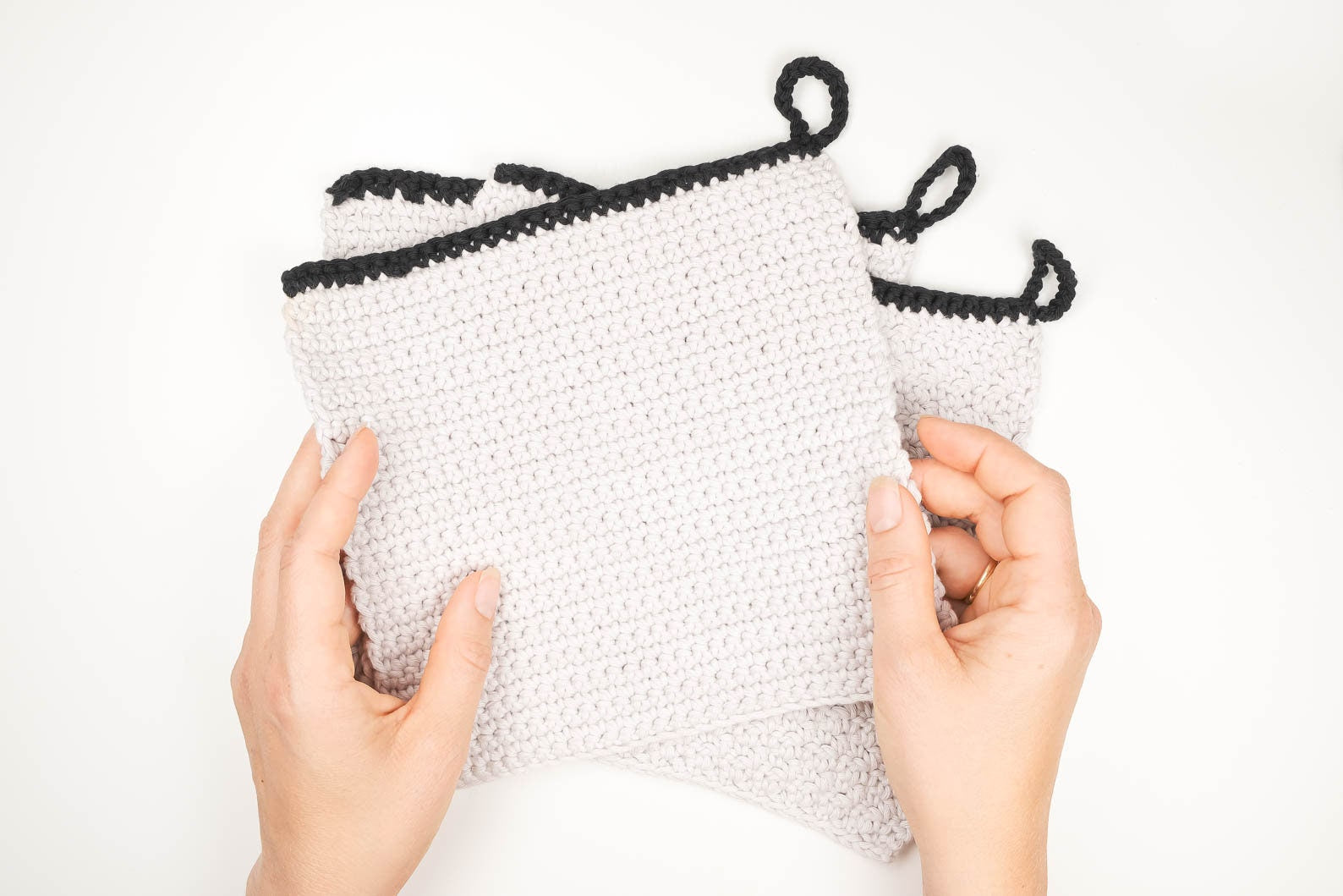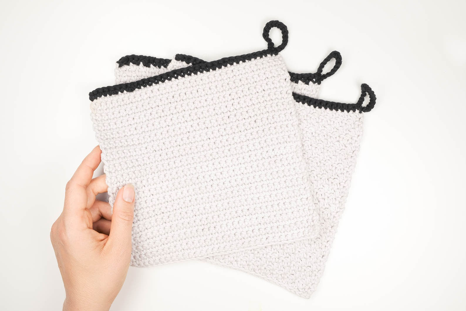 50 grams (1 skein) of the color Mist (097) + 5 grams of the color Black (009) for each dishcloth